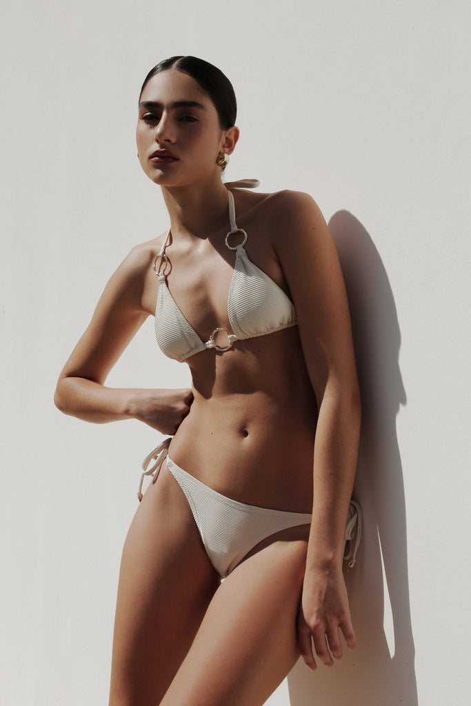 Desfrute do sol e de um bronze perfeito com o nosso lindo biquíni cortininha de argola! Seu tom offwhite é perfeito para realçar seu tom de pele enquanto você se desfruta . Combine com a nossa mini saia offwhite.